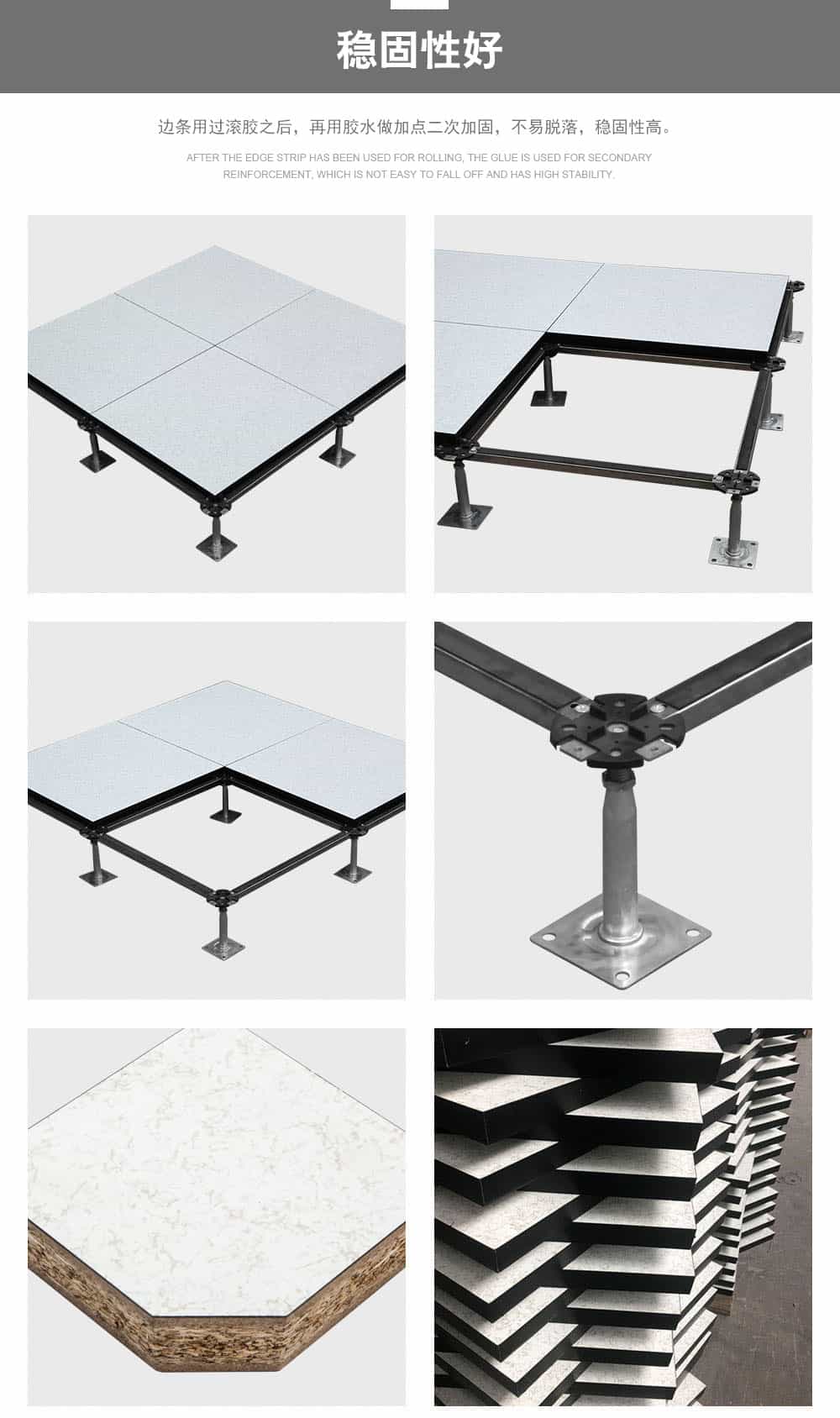 歐式復(fù)合地板,板芯采用、未經(jīng)加工的中高密度刨花板基,上面粘貼HPL(防火板)、PVC、陶瓷、等不同裝飾面層,下面粘貼鍍鋅鋼板/鋁板/鋁箔,四周導(dǎo)靜電黑膠條封邊,阻止機(jī)械損壞及潮濕變形。通過阻燃劑的添加,使其達(dá)到B1級防火,且具有較輕的自重,達(dá)到更高的承載能力和環(huán)保水平,標(biāo)配出口型加重配件。